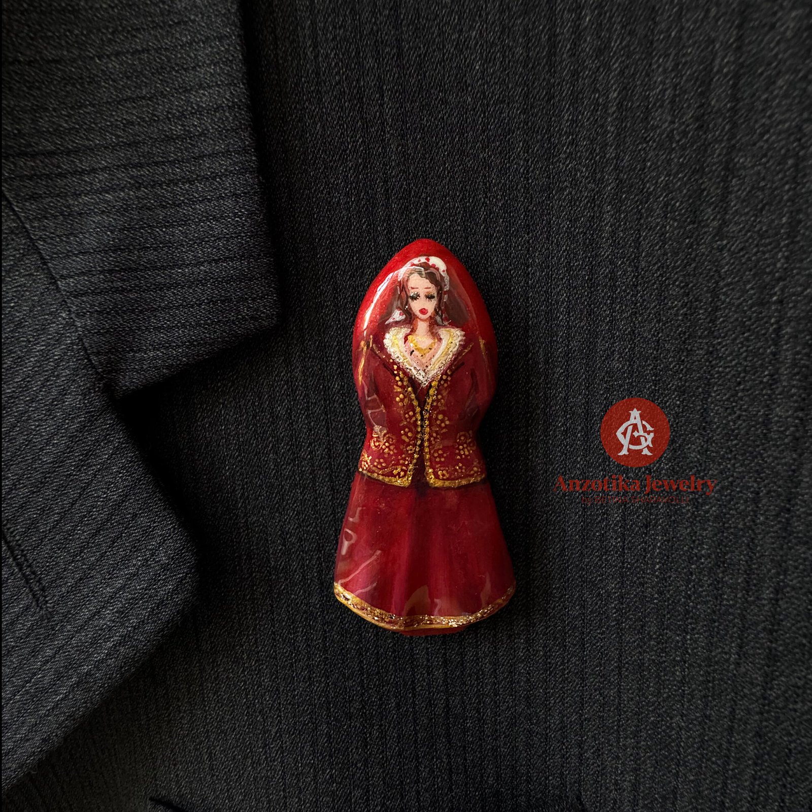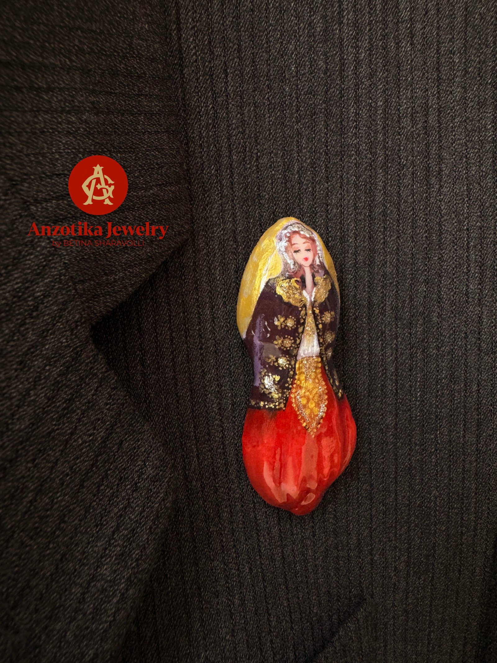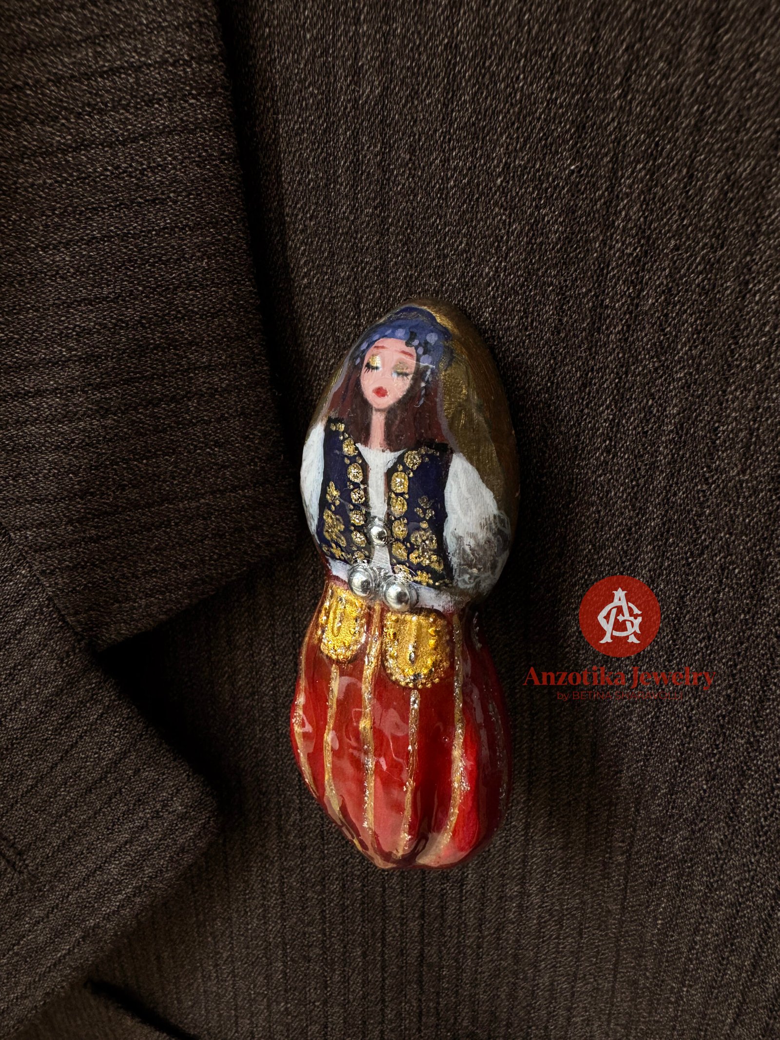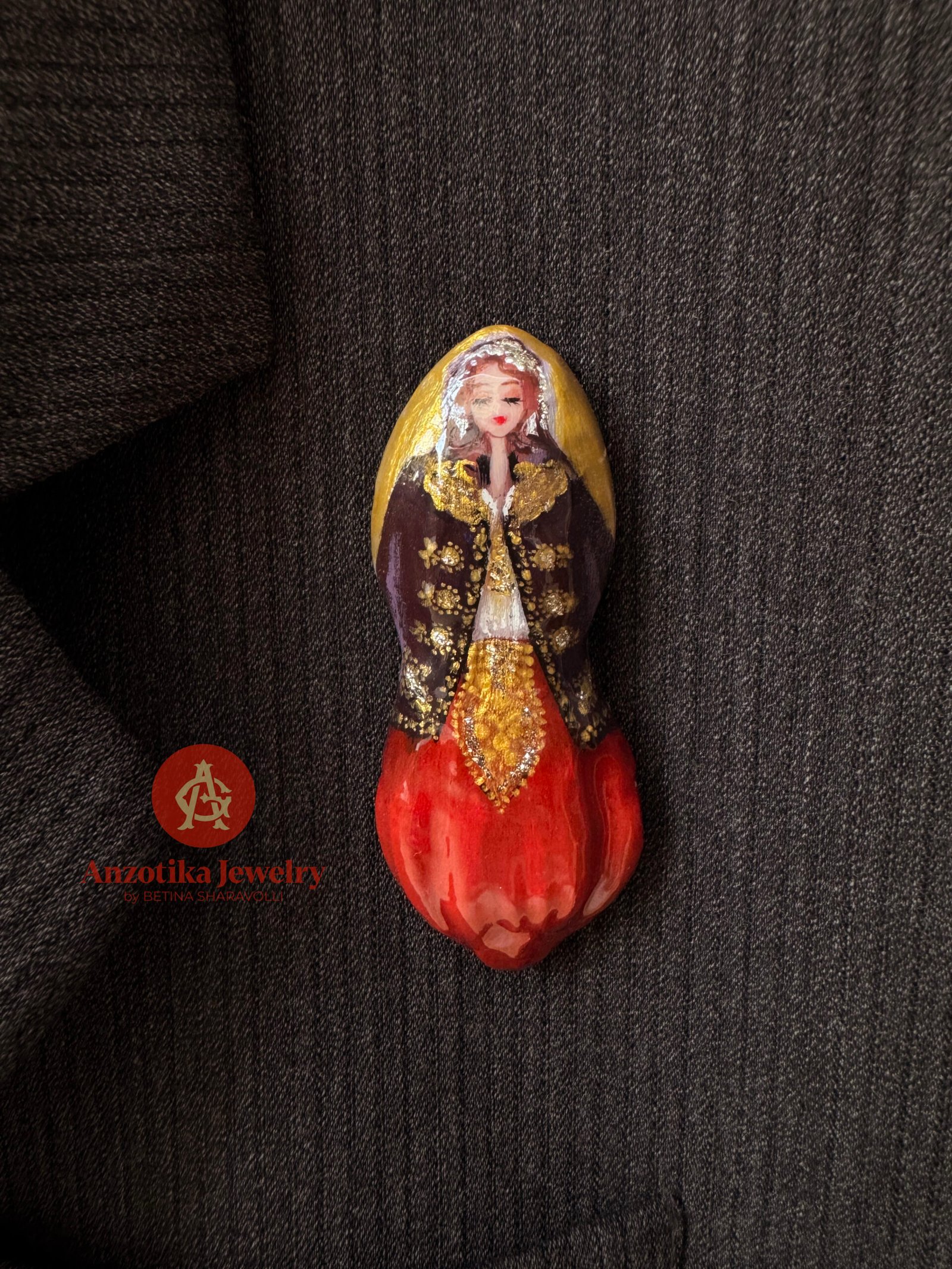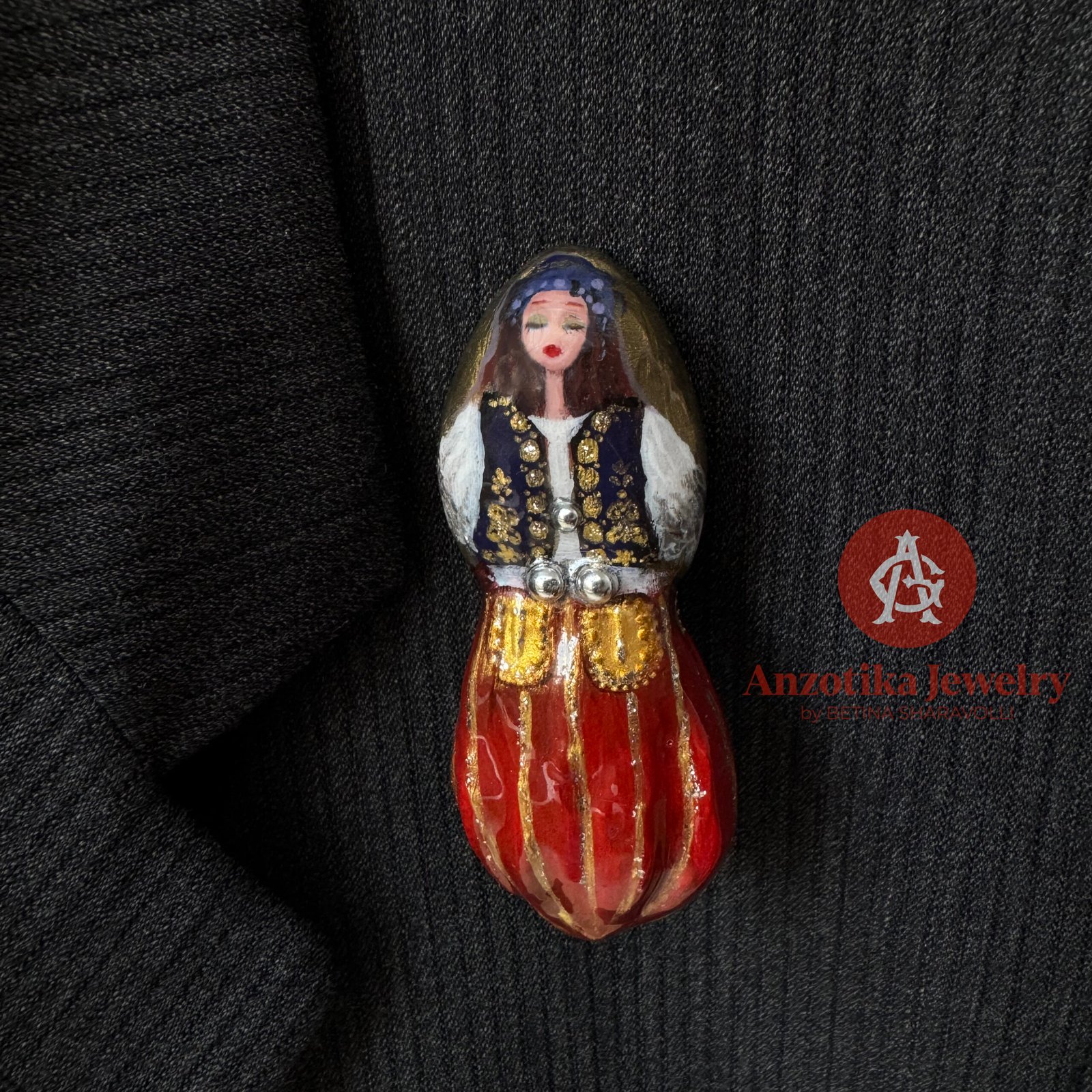 Elementët janë interpretuar në miniaturë dhe pikturuar me dorë me kujdes të veçantë, duke ruajtur elegancën e nuses çame në një format elegant dhe të lehtë për t’u mbajtur çdo ditë. Një aksesor i vogël në përmasa, por me ndjesi të thellë kulturore.